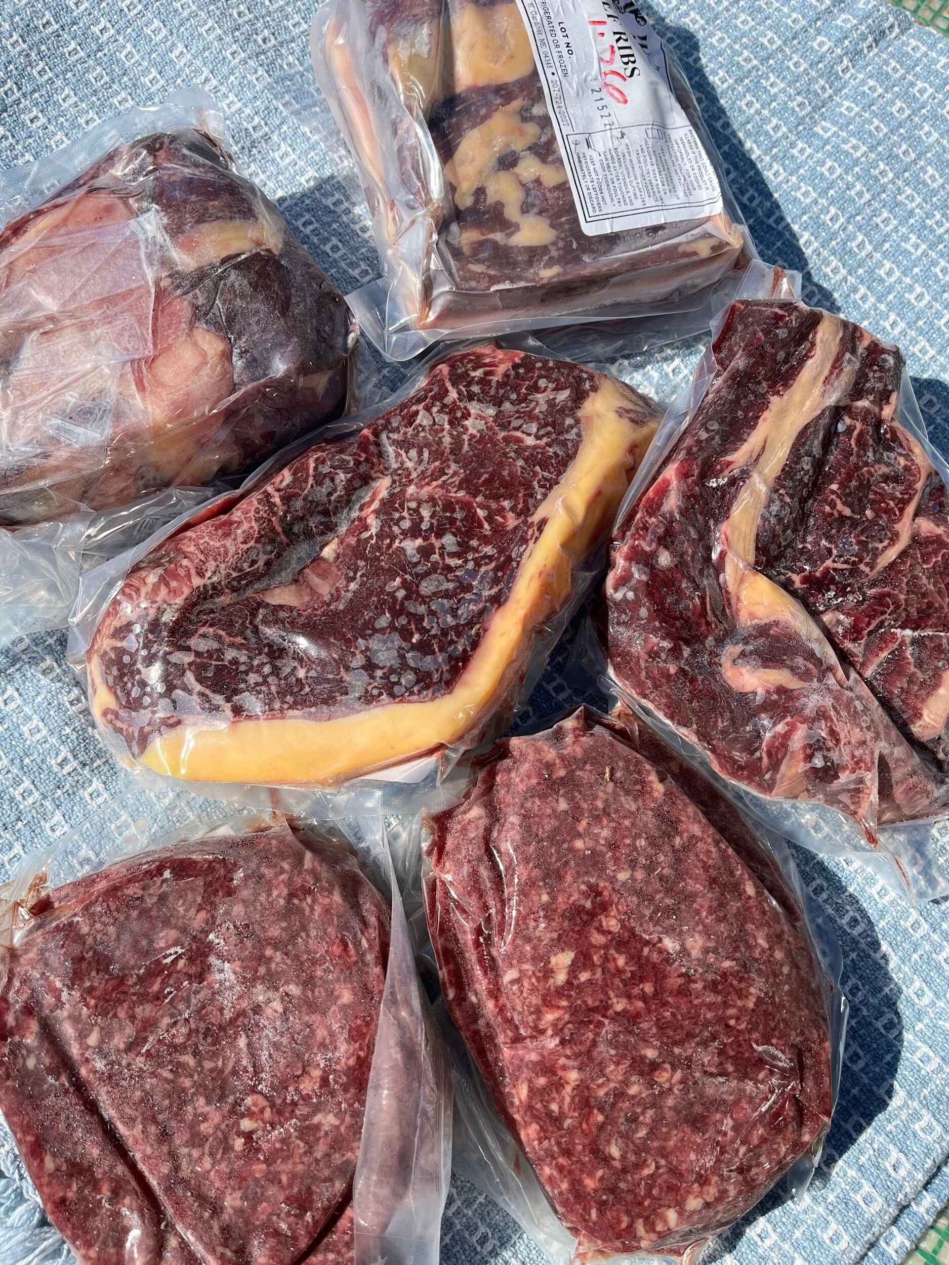 This is a 10# sampler pack with Ground beef, soup bones, and steak.